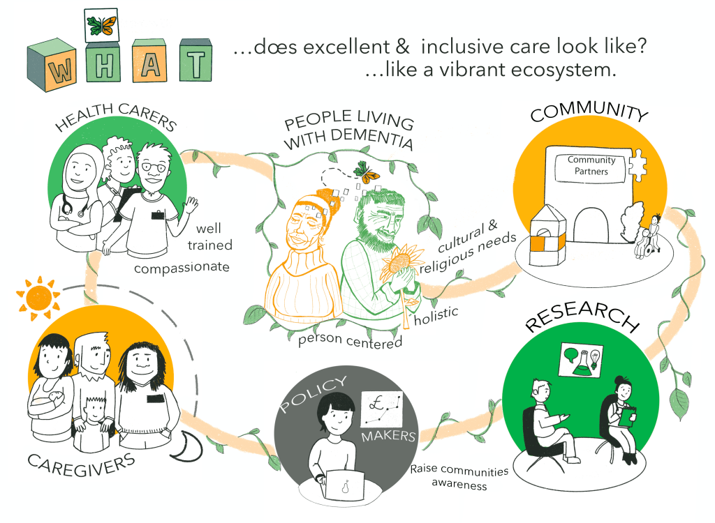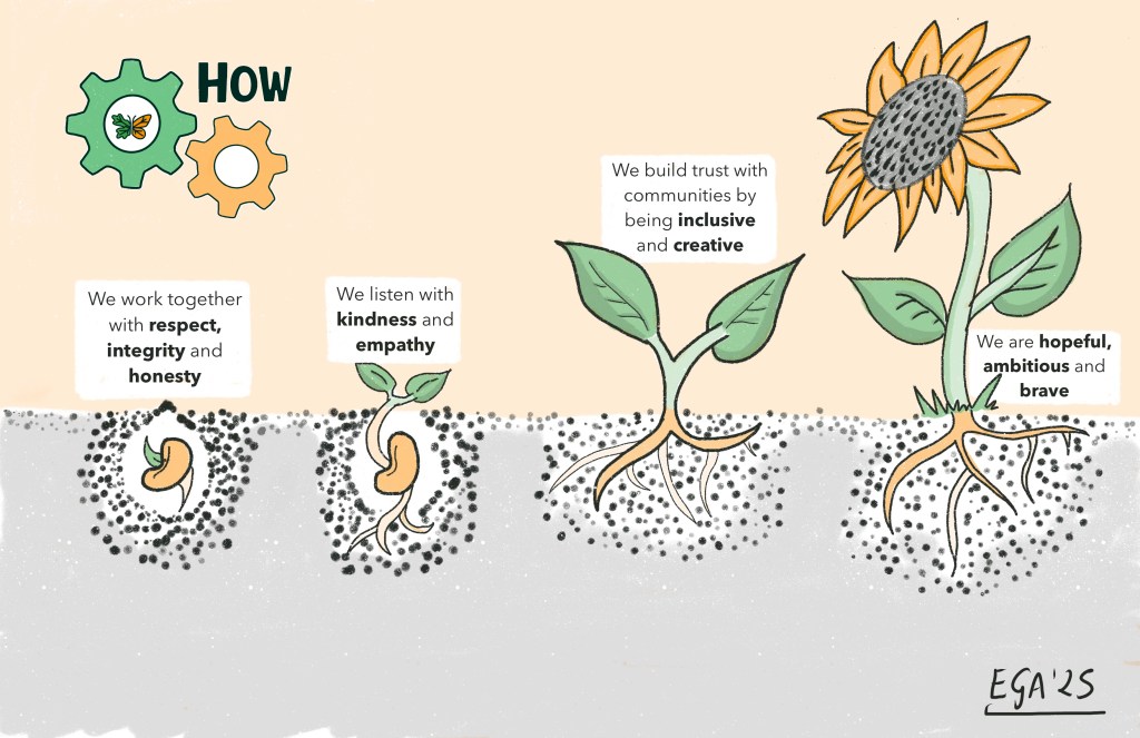 Estas ilustraciones fueron creadas tras asistir a un taller de co-creación con el equipo EMPOWER+ (Cicely Saunders Institute-KCL). Tras haber realizado una serie de talleres en al comunidad, con la información subyacente procedieron a redactar protocolos de la visión y propóstito de su proyecto a través de metodología cualitativa. Me di cuenta de cómo los procesos cualitativos favorecen la creatividad, ya que clasificamos parte de la información como «metáforas», y de una de ellas surgió la siguiente ilustración, que fue impresa como postal y repartida en eventos en la comunidad.
