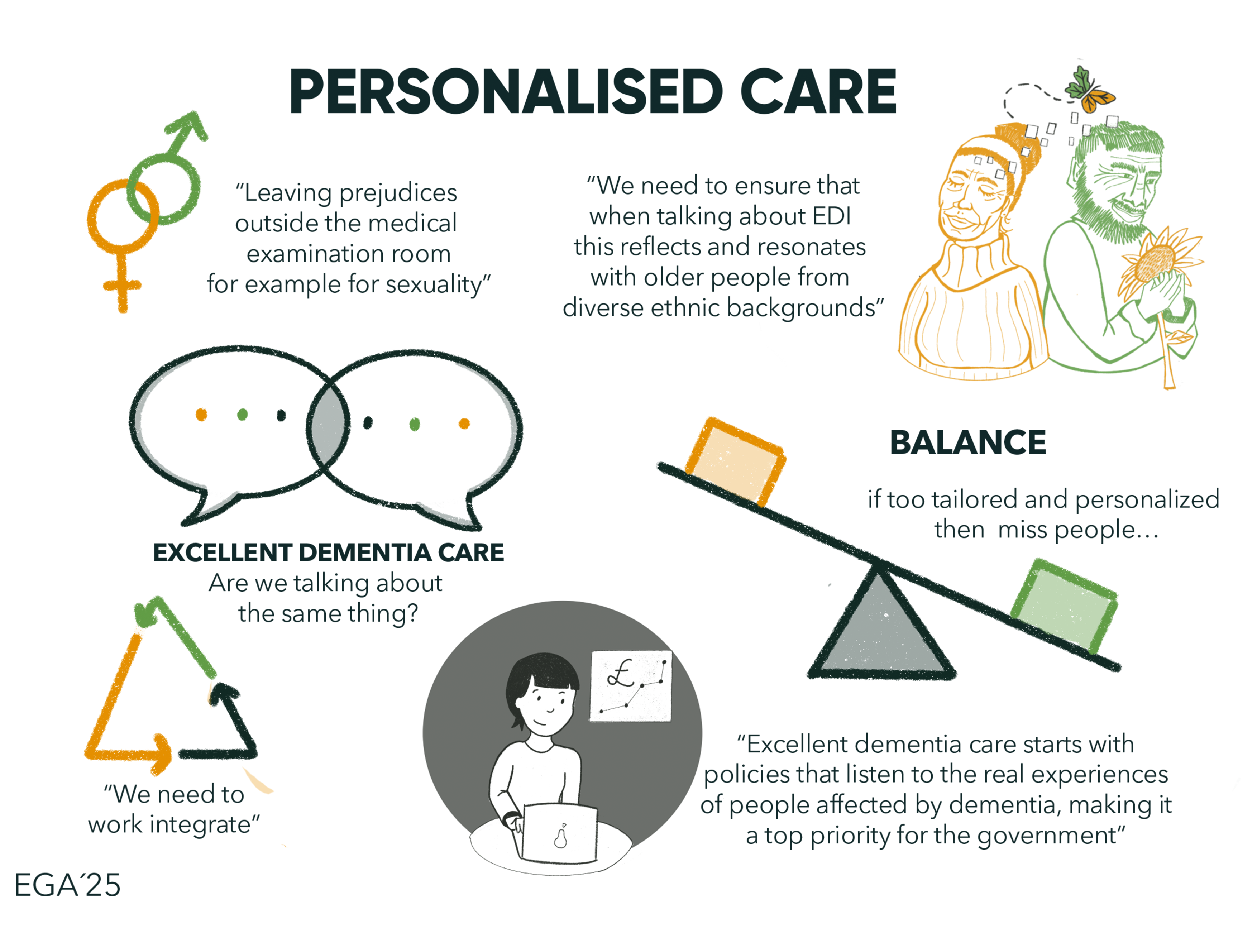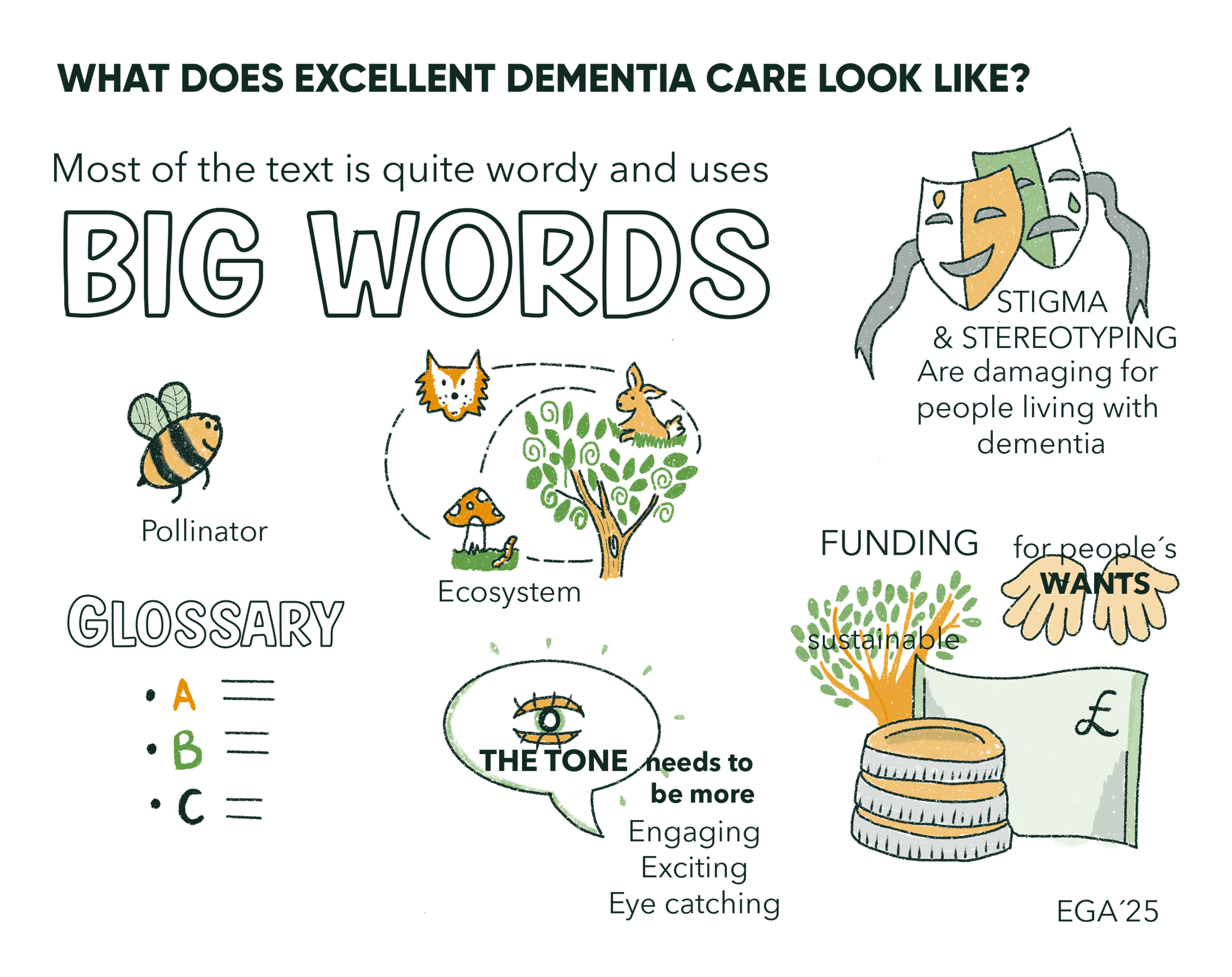 The illustrations followed up a process of evaluation by a group por patients living experts («PLEDGE»). From their vision I made the changes the drawings needed to be as much inclusive and representative as possible. From this meeting I made some graphic notes.
